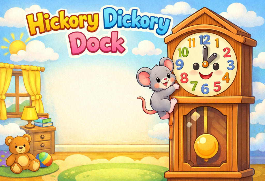 Hickory Dickory Dock is a classic nursery rhyme about a little mouse who runs up a clock while it strikes the hour. As the clock chimes, the mouse quickly runs back down, making the rhyme playful and exciting for young listeners. Children love the ticking sound, the repeating words, and the simple storyline that is easy to follow.