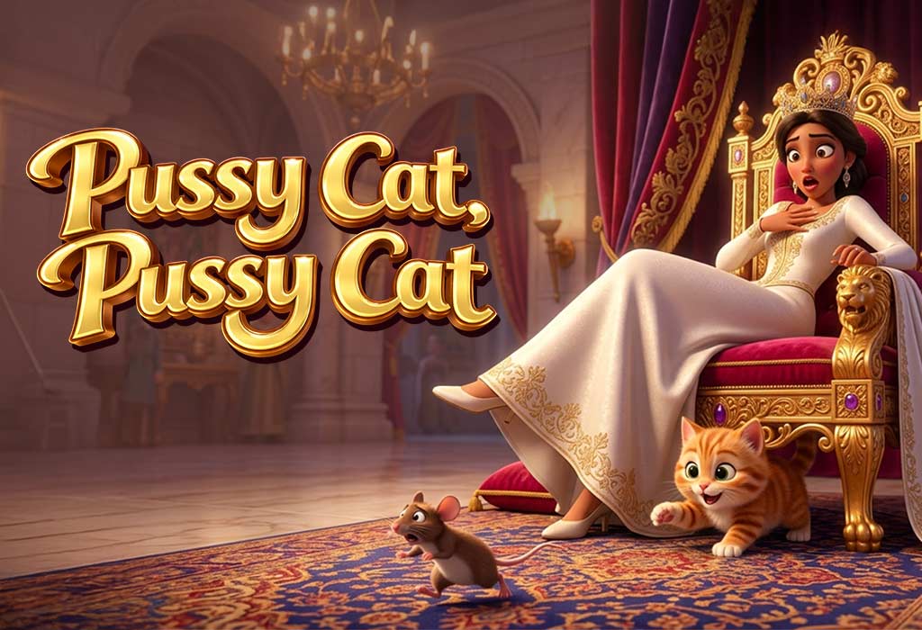 Pussy Cat, Pussy Cat is a classic nursery rhyme about a curious little cat who travels to London to visit the Queen. Instead of being impressed by royalty, the cat becomes more interested in chasing a small mouse under the chair. This playful and simple storyline makes children smile and sparks their imagination. Kids enjoy the rhyme because it is short, rhythmic, and easy to remember. The gentle humor and repetition help little ones join in quickly. For parents and teachers, this rhyme is a lovely tool for early learning. It supports listening skills, builds vocabulary, improves pronunciation, and introduces children to rhyming patterns in a fun and engaging way.