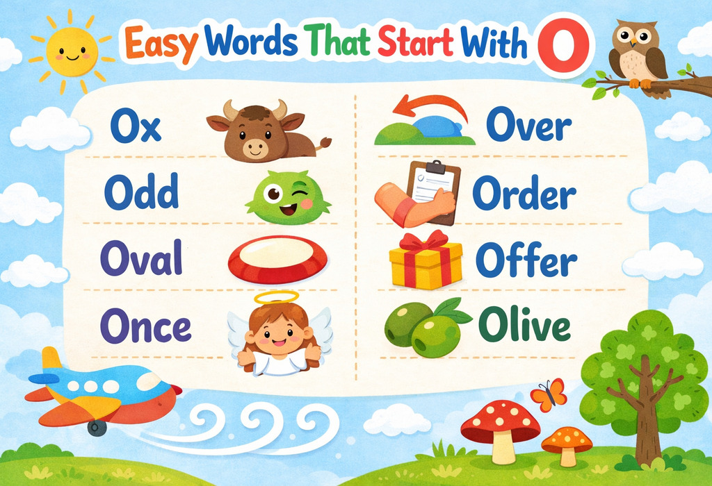 Kids learn best when words feel simple and friendly and easy to say. These easy words beginning with o help them build confidence without feeling confused or tired. Using simple words that begin with o in daily talk makes learning feel natural and fun.